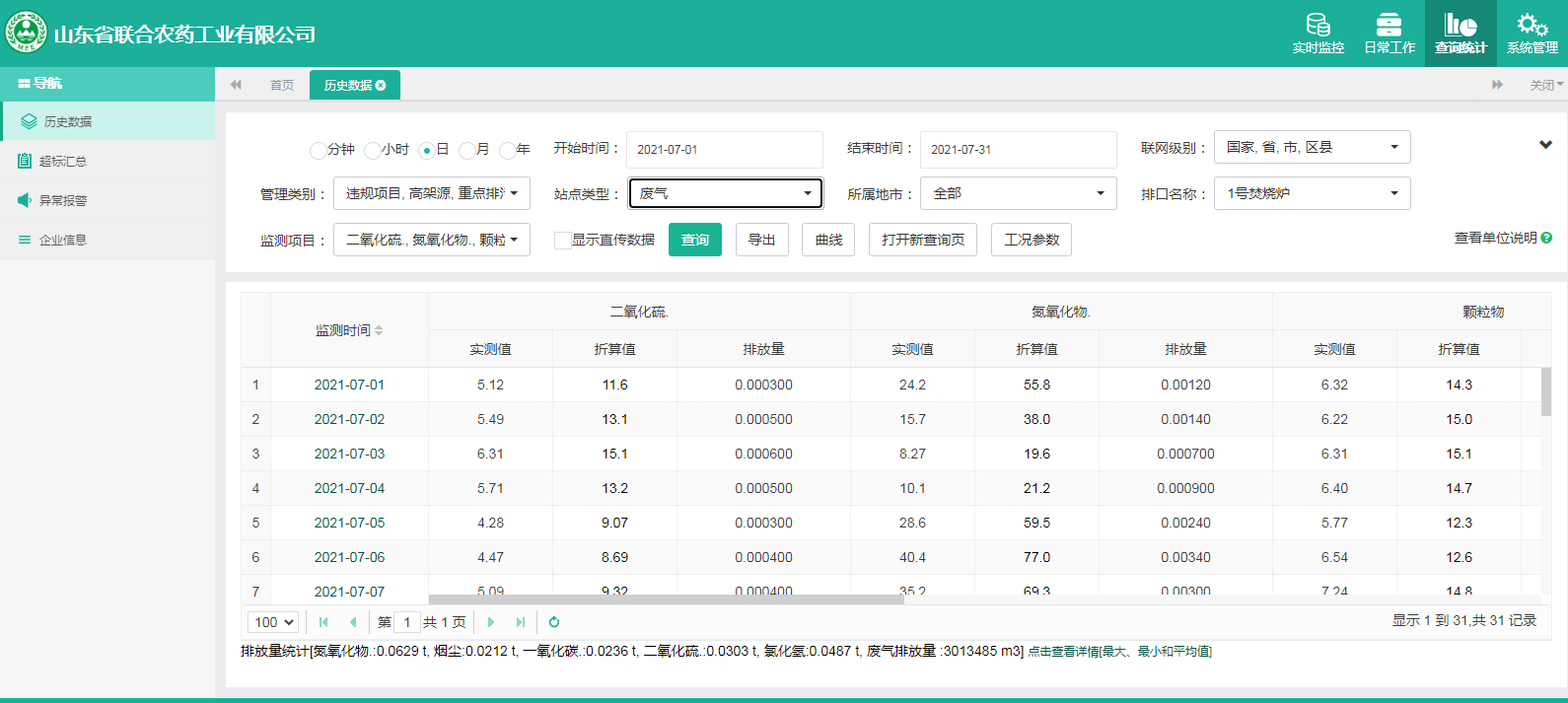 主要污染物包括COD、氨氮、二氧化硫,氮氧化物、烟尘、氯化氢、一氧化碳。其中废水中的COD、氨氮经厂区内污水处理设施处理达标排放,污水排放口污染因子COD、氨氮符合《流域水污染物综合排放标准 第1部分南四湖东平湖流域》(DB37/3416.1-2018)一般保护区标准,COD低于60mg/l,氨氮低于10mg/l。锅炉废气、导热油炉废气通过废气处理设施处理后经过烟囱高空排放,排放的烟气符合《山东省锅炉大气污染物综合排放标准(DB37/2374-2018)表2一般控制区及《区域性大气污染物综合排放标准》(GB37/2376-2019),SO2低于50 mg/m³,NOx低于200 mg/m³,烟尘低于10 mg/m³。焚烧炉废气通过废气处理设施处理后经过烟囱高空排放,排放的烟气符合《农药制造工业大气污染物排放标准》(GB39727-2020)表1、表2标准、《危险废物焚烧污染控制标准》(GB18484-2001)表3及《区域性大气污染物综合排放标准》(GB37/2376-2019)表2一般控制区标准,SO2低于100 mg/m³,NOx低于200 mg/m³,烟尘低于20 mg/m³,HCL低于60 mg/m³,一氧化碳低于80mg/m³。有组织废气排放符合《挥发性有机物排放标准 第6部分:有机化工行业》(DB37/2801.6-2018)表1标准,《农药制造工业大气污染物排放标准》(GB39727-2020)表1、表2标准、即甲醇低于50mg/m³,甲苯低于5mg/m³, VOCs低于60mg/m³。