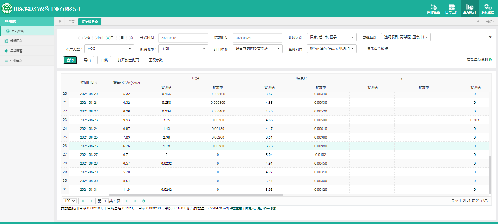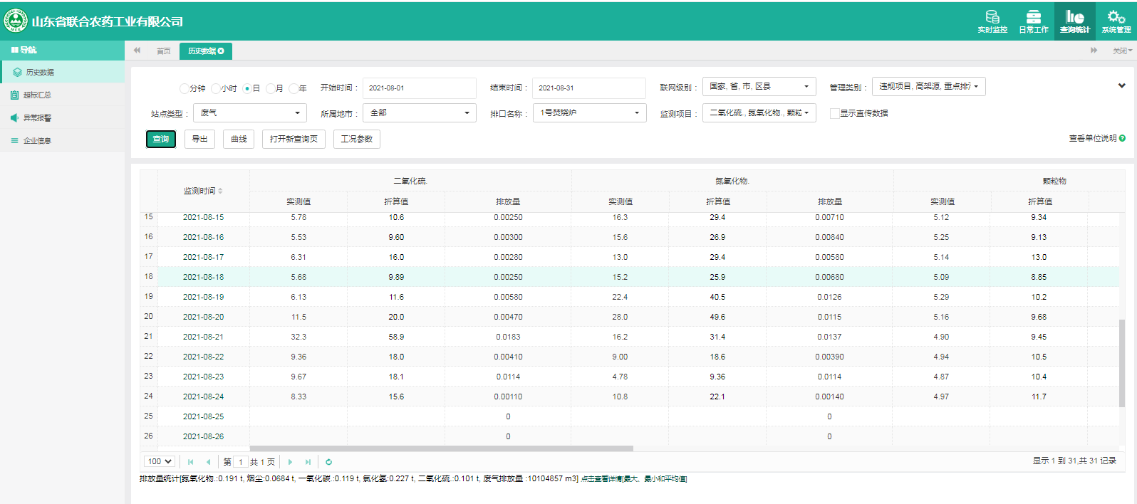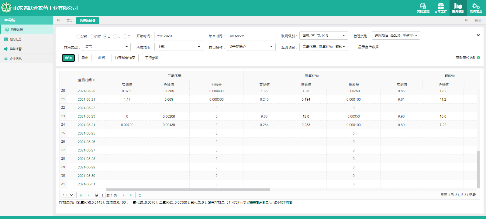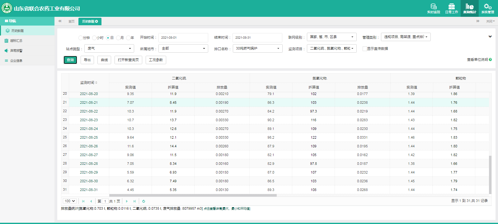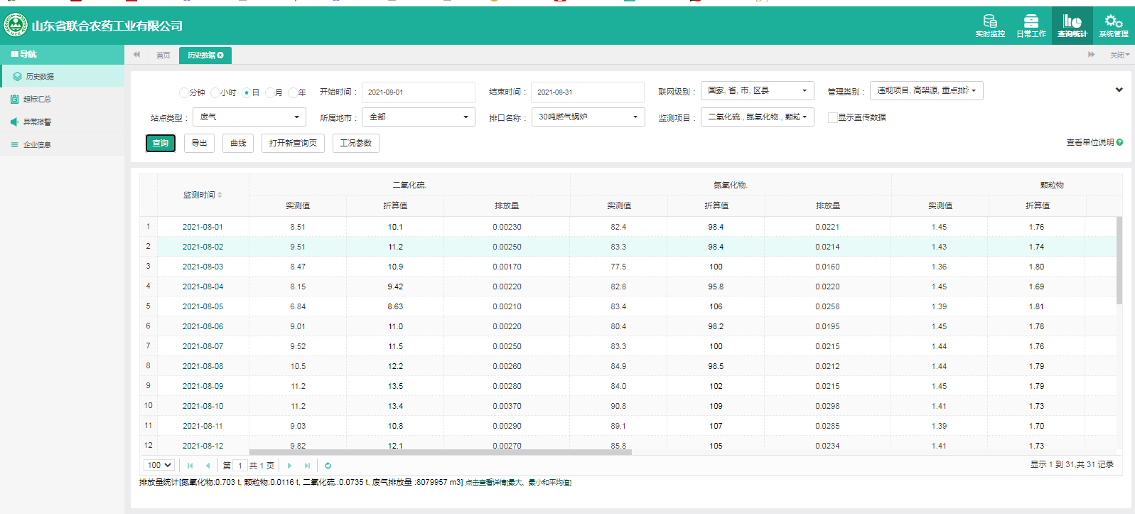 主要污染物包括COD、氨氮、二氧化硫,氮氧化物、烟尘、氯化氢、一氧化碳。其中废水中的COD、氨氮经厂区内污水处理设施处理达标排放,污水排放口污染因子COD、氨氮符合《流域水污染物综合排放标准 第1部分南四湖东平湖流域》(DB37/3416.1-2018)一般保护区标准,COD低于60mg/l,氨氮低于10mg/l。锅炉废气、导热油炉废气通过废气处理设施处理后经过烟囱高空排放,排放的烟气符合《山东省锅炉大气污染物综合排放标准(DB37/2374-2018)表2一般控制区及《区域性大气污染物综合排放标准》(GB37/2376-2019),SO2低于50 mg/m³,NOx低于200 mg/m³,烟尘低于10 mg/m³。焚烧炉废气通过废气处理设施处理后经过烟囱高空排放,排放的烟气符合《农药制造工业大气污染物排放标准》(GB39727-2020)表1、表2标准、《危险废物焚烧污染控制标准》(GB18484-2001)表3及《区域性大气污染物综合排放标准》(GB37/2376-2019)表2一般控制区标准,SO2低于100 mg/m³,NOx低于200 mg/m³,烟尘低于20 mg/m³,HCL低于60 mg/m³,一氧化碳低于80mg/m³。有组织废气排放符合《挥发性有机物排放标准 第6部分:有机化工行业》(DB37/2801.6-2018)表1标准,《农药制造工业大气污染物排放标准》(GB39727-2020)表1、表2标准、即甲醇低于50mg/m³,甲苯低于5mg/m³, VOCs低于60mg/m³。