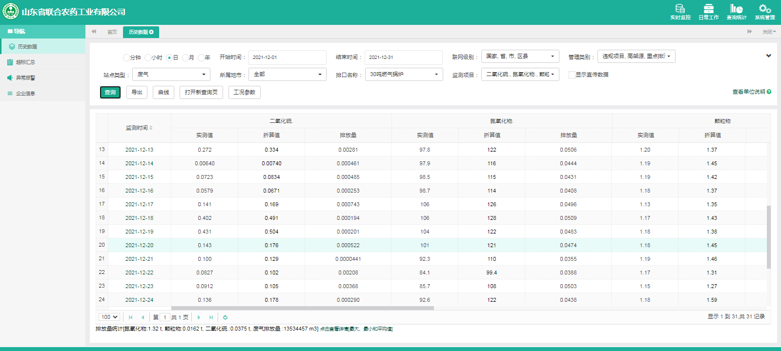 主要污染物包括COD、氨氮、二氧化硫,氮氧化物、烟尘、氯化氢、一氧化碳。其中废水中的COD、氨氮经厂区内污水处理设施处理达标排放,污水排放口污染因子COD、氨氮符合《流域水污染物综合排放标准 第1部分南四湖东平湖流域》(DB37/3416.1-2018)一般保护区标准,COD低于60mg/l,氨氮低于10mg/l。锅炉废气、导热油炉废气通过废气处理设施处理后经过烟囱高空排放,排放的烟气符合《山东省锅炉大气污染物综合排放标准(DB37/2374-2018)表2一般控制区及《区域性大气污染物综合排放标准》(GB37/2376-2019),SO2低于50 mg/m³,NOx低于200 mg/m³,烟尘低于10 mg/m³。焚烧炉废气通过废气处理设施处理后经过烟囱高空排放,排放的烟气符合《农药制造工业大气污染物排放标准》(GB39727-2020)表1、表2标准、《危险废物焚烧污染控制标准》(GB18484-2001)表3及《区域性大气污染物综合排放标准》(GB37/2376-2019)表2一般控制区标准,SO2低于100 mg/m³,NOx低于200 mg/m³,烟尘低于20 mg/m³,HCL低于60 mg/m³,一氧化碳低于80mg/m³。有组织废气排放符合《挥发性有机物排放标准 第6部分:有机化工行业》(DB37/2801.6-2018)表1标准,《农药制造工业大气污染物排放标准》(GB39727-2020)表1、表2标准、即甲醇低于50mg/m³,甲苯低于5mg/m³, VOCs低于60mg/m³。